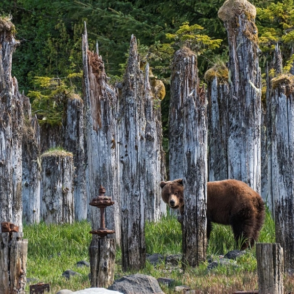 როკი გრაიმსი - მურა დათვი ძველ ხის ძელებს შორის ტაკუს ყურეში, ალასკა.