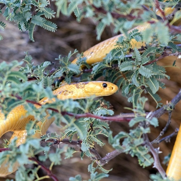 Greatstock - კაპის კობრა, იგივე ყვითელი კობრა (Naja nivea) ფრინველის ბუდეს უახლოვდება კგალაგადის პარკში, სამხრეთ აფრიკა.