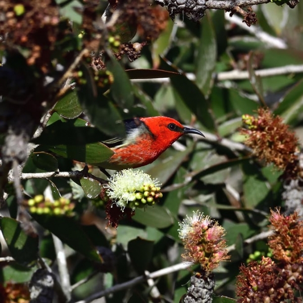 Alamy - მამრი მეწამული მიზომელა (Myzomela sanguinolenta) კალისტემონის ტოტზე, ბრიზბენი, ავსტრალია.