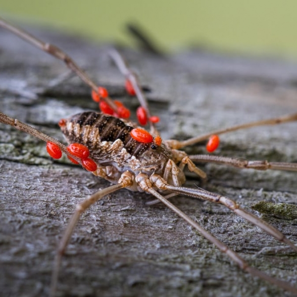 რებეკა კოული - პარაზიტი ტკიპებით დახუნძლული მთიბავი (Opiliones) ინგლისის მდელოზე.