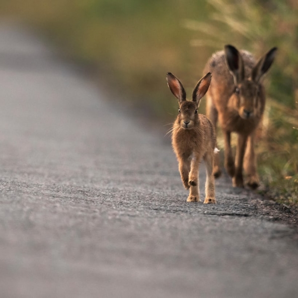 ჯერომ მიურეი - ევროპული რუხი კურდღელი (Lepus europaeus) და მისი ბაჭია გლოსტერის გზაზე.