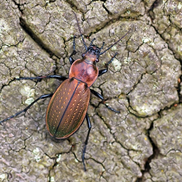მეტ ბერი - ევროპული ყელსაბამიანი ხოჭო (Carabus monilis) ფერმის მიწაზე, ინგლისი.