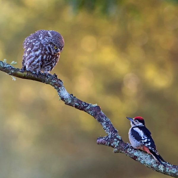 ფილ უინტერი - პატარა ბუ და პატარა კოდალა ერთმანეთს უცქერენ ხის ტოტზე, რინგმერში, აღმოსავლეთ ესექსი, ინგლისი.