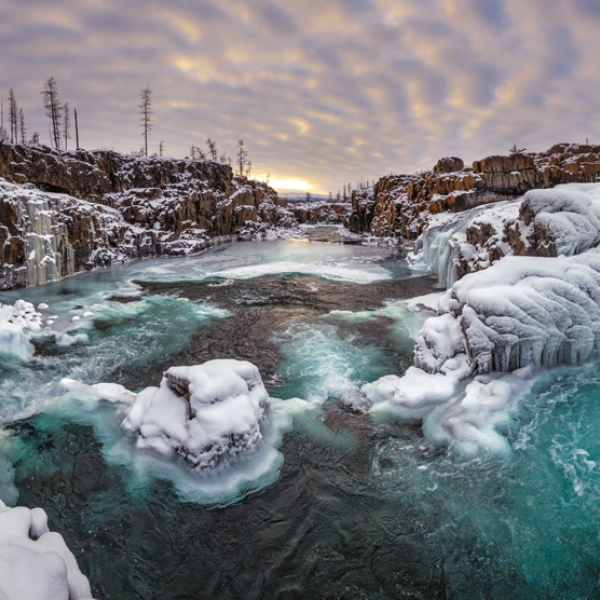 პუტორანის პლატოზე ათასობით ტბა და ჩანჩქერია. ხვრელიდან გამოჟონილი წყალი ლამის ტბის წყალმცენარეებით შეფერილ გაყინულ ზედაპირზე იტოტება.