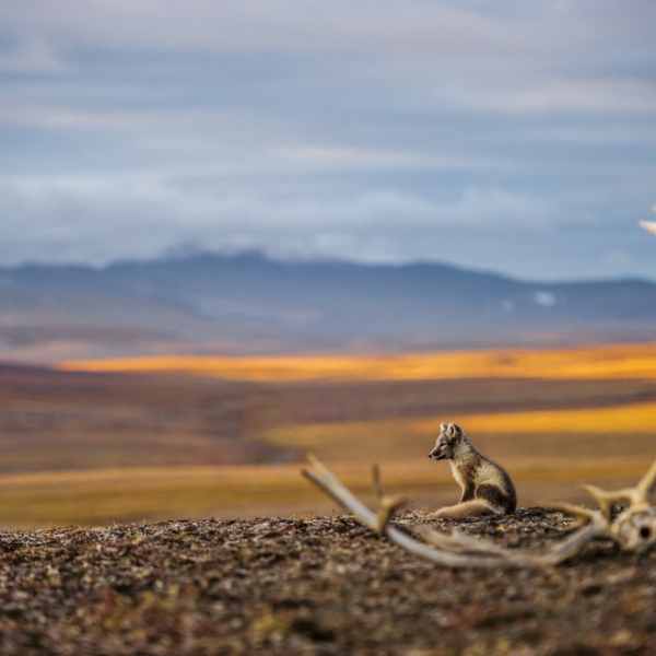 ნორჩი არქტიკული მელა ჩუკოტკის ზღვაში მდებარე ვრანგელის კუნძულზე ჩამავალი მზის ფონზე.