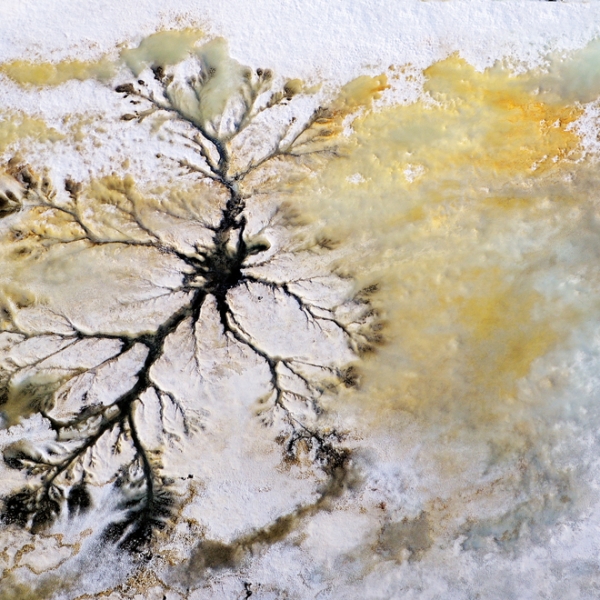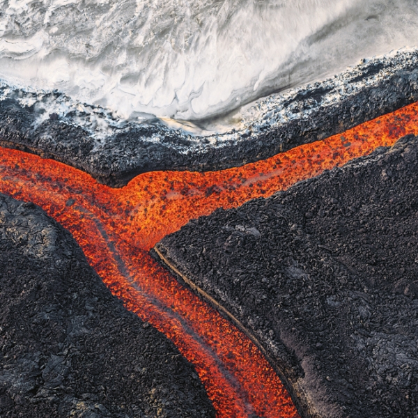 კამჩატკის ნახევარკუნძულზე მდებარე კლიუჩევსკოის ეროვნულ პარკში ბრტყელი ტოლბაჩიკის თოვლიან მწვერვალთან ახლოს ორი ლავური ნაკადი ერთმანეთს ერწყმის.