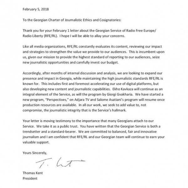 თქვენი წერილი მოწმობს თუ რამდენად მნიშვნელოვანია ბევრი ქართველისთვის ჩვენი სერვისი. ჩვენ ამას საჯარო ნდობად მივიჩნევთ. თქვენ ამბობთ, რომ ქართული სამსახური არის როგორც მიმართულების განმსაზღვრელი, ასევე სტანდარტების დამამკვიდრებელი. ჩვენ ვართ დაბალანსებული, მიუკერძოებელი და ინოვაციური ჟურნალისტიკის ერთგული და დარწმუნებული ვარ, რომ რადიო თავისუფალი ევროპა/რადიო თავისუფლებას და ჩვენსქართულ ჯგუფს ექნება თქვენი ძვირფასი მხარდაჭერა“, - ნატქვამია ტომას კენტის წერილში.