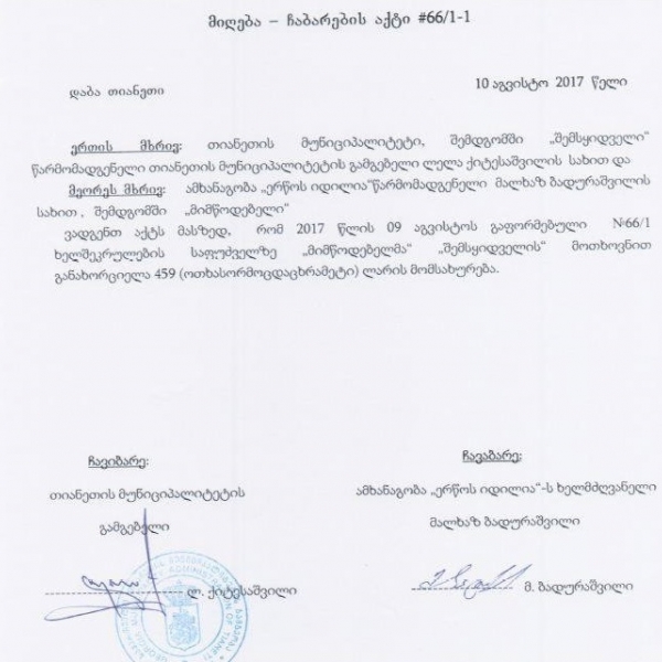 ზაქარია ქუცნაშვილმა თიანეთის გამგეობისგან ყოფილი ფოსტის შენობა 1485 ლარად იყიდა