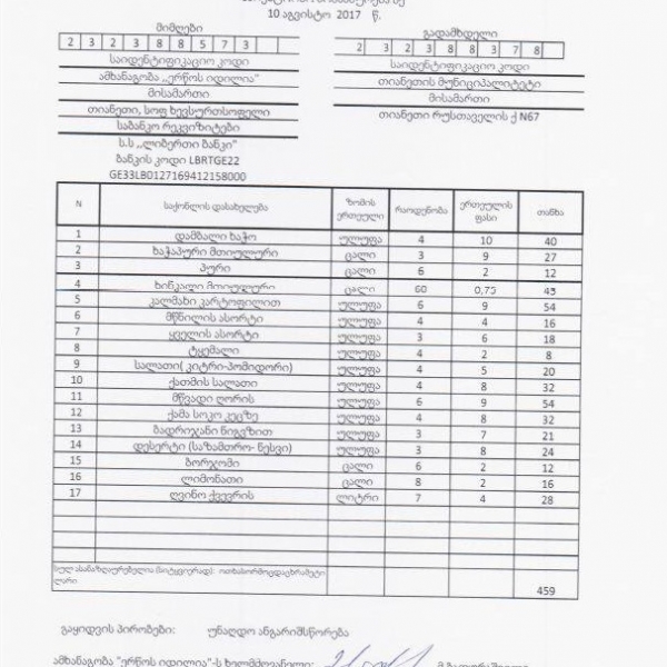 სარესტორნო მომსახურების დოკუმენტში (ინვოისში) მითითებულია სუფრის მენიუ და ფასები: