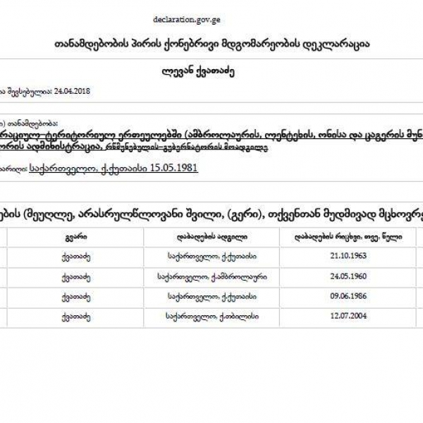 ლევან ქვათაძეს ქონებრივ დეკლარაციაში მშობლები ოჯახის წევრების გრაფაში ჰყავს მითითებული.