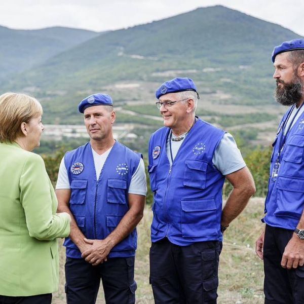„კანცლერი მერკელი სამხრეთ ოსეთის მოსაზღვრე რეგიონში ესაუბრება ადგილობრივ მცხოვრებლებს და ეწვია ევროპის სადამკვირვებლო მისიას, რომელიც კონფლიქტურ რეგიონში მშვიდობიან თანაცხოვრებას უზრუნველყოფს“, – წერია მერკელის „ინსტაგრამის“ გვერდზე.
