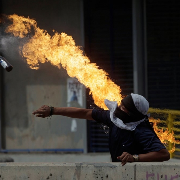 ხორხე კაბრერა - ტეგუსიგალპა, ჰონდურასი: პრეზიდენტ ხუან ორლანდო ერნანდესის საწინააღმდეგო აქციის მონაწილე დემონსტრანტი პოლიციელების მიმართულებით ე.წ. მოლოტოვის კოქტეილს ისვრის.