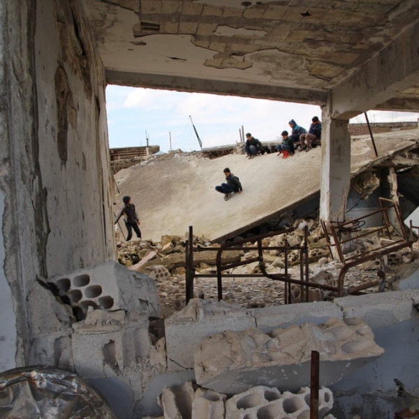 იბრაჰიმ იასუფი - ჯისრ ალ-შუღური, სირია: ბავშვები იდლიბის პროვინციაში დანგრეული შენობის კედელს სასრიალოდ იყენებენ.