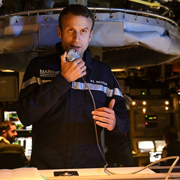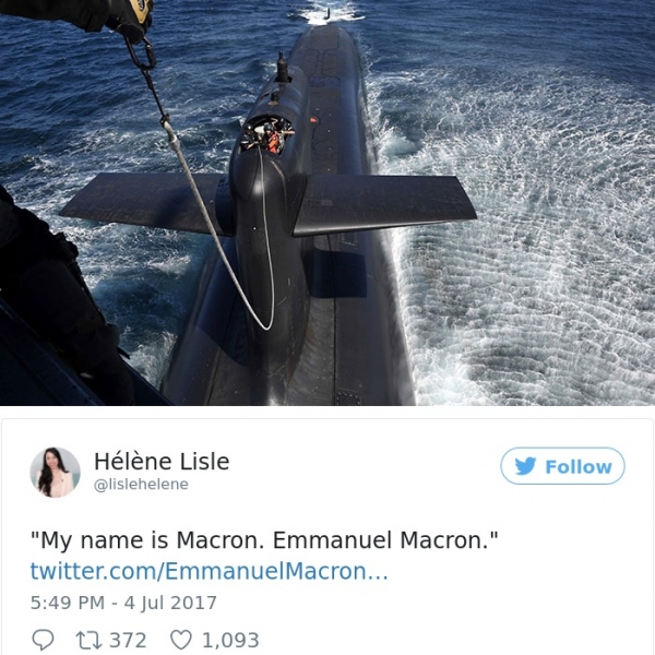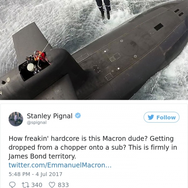 ემანუელ მაკრონი ფრანგულ ატომურ წყალქვეშა ნავ „ლე ტერიბლზე“ ვერტმფრენიდან დაეშვა, ვიზიტის ამსახველი ფოტოები კი სოციალურ ქსელ „ტვიტერში“ პოპულარული გახდა და უამრავმა მომხმარებელმაც საფრანგეთის პრეზიდენტს ცნობილი პერსონაჟის, ჯეიმს ბონდის რეალურ პროტოტიპად შერაცხა.