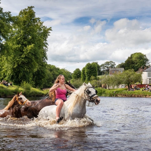 დენი ლოუსონი - ეპლბი, ინგლისი: ყოველწლიური ფესტივალის მონაწილე ცხენოსანი ქალი მდინარე ედენში.