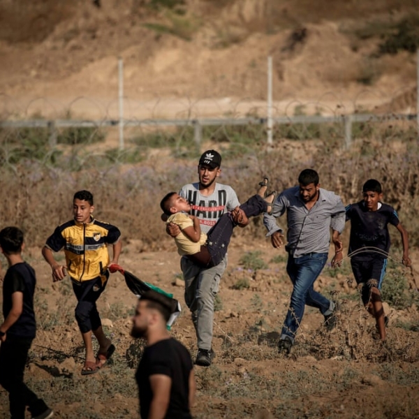 მოჰამედ აბედი - ღაზა, პალესტინა: პალესტინელებს დაშავებული დემონსტრანტი სირბილით გაყავთ პროტესტის ადგილიდან, რომელსაც ისრაელის სპეცრაზმელებმა შეუტიეს.