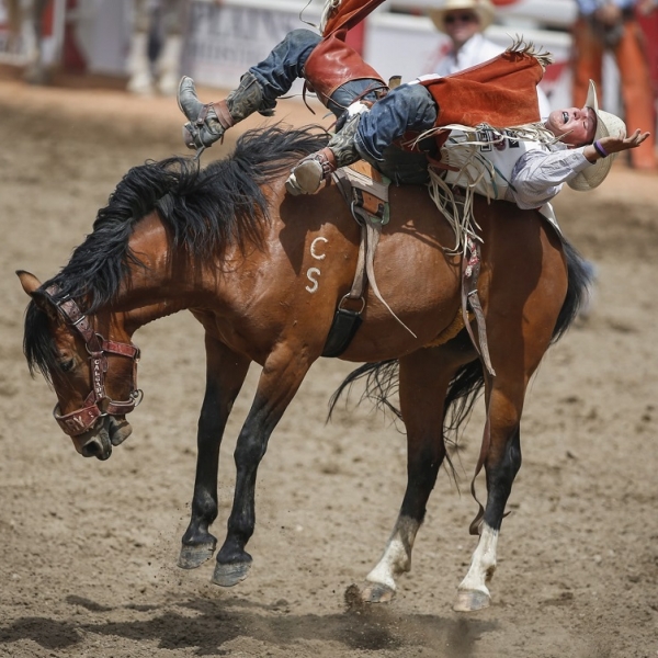 ჯეფ მაკინტოში - კალგარი, კანადა: როდეოს მონაწილე კლეიტონ ბიგლოუ ცხენზე გამაგრებას ცდილობს.