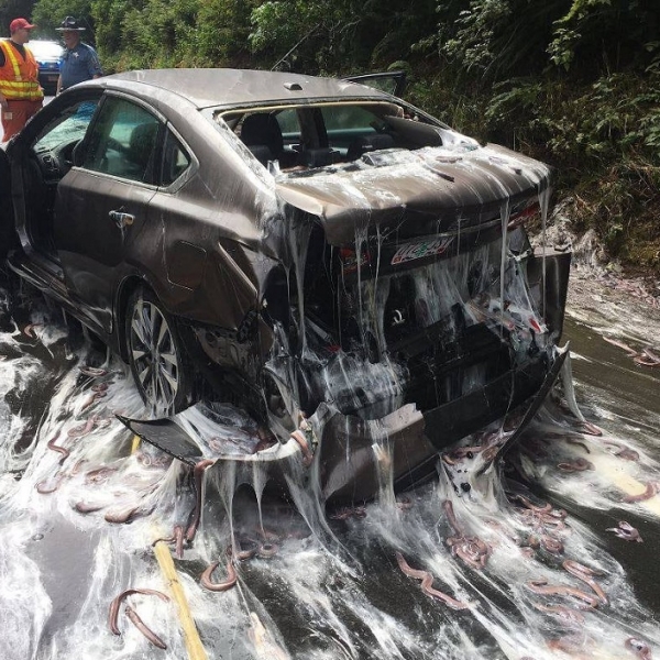 Reuters - ორეგონი, აშშ: მიქსინებით სავსე ავტომობილი ავარიისას გადაბრუნდა.