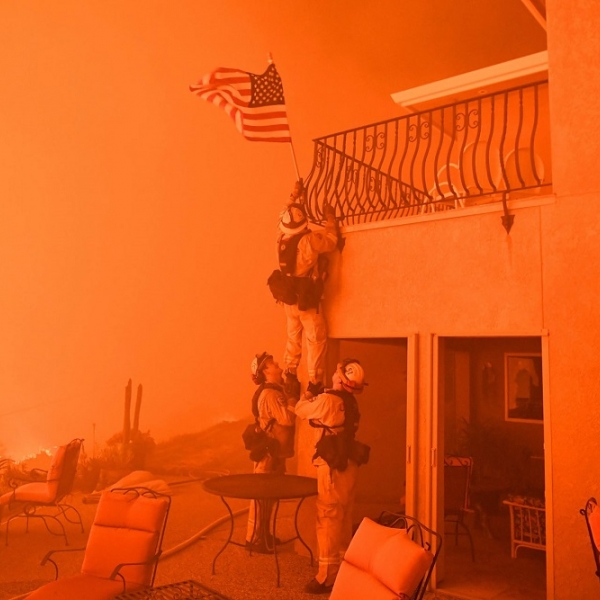 ჯოშ ედელსონი - ოროვილი, აშშ: კალიფორნიის შტატში გაჩენილი ხანძრის შემდეგ მეხანძრეები საცხოვრებელი სახლიდან ეროვნულ დროშას ხსნიან.