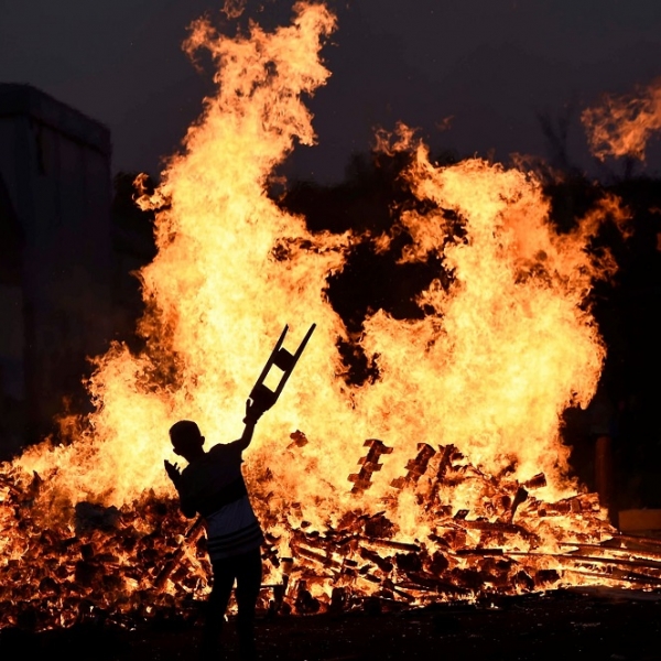 კლოდახ კილკოინი - ბელფასტი, ჩრდილოეთ ირლანდია: პატარა ბიჭი ხის სკამს წვავს კოცონზე 12 ივლისის დღის აღსანიშნავად.