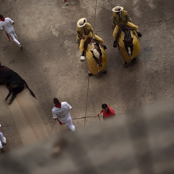 ალვარო ბარიენტოსი - პამპლონა, ესპანეთი: ხანდილიას რანჩოდან მოყვანილი ხარი არენიდან თრევით მიჰყავთ სან ფერმინის ფესტივალისას.