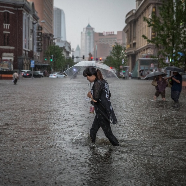 რომან პილიპეი - შენიანი, ჩინეთი: კოკისპირული წვიმებისას დატბორილ ქალაქში ქალი ფეხით გადაადგილდება.