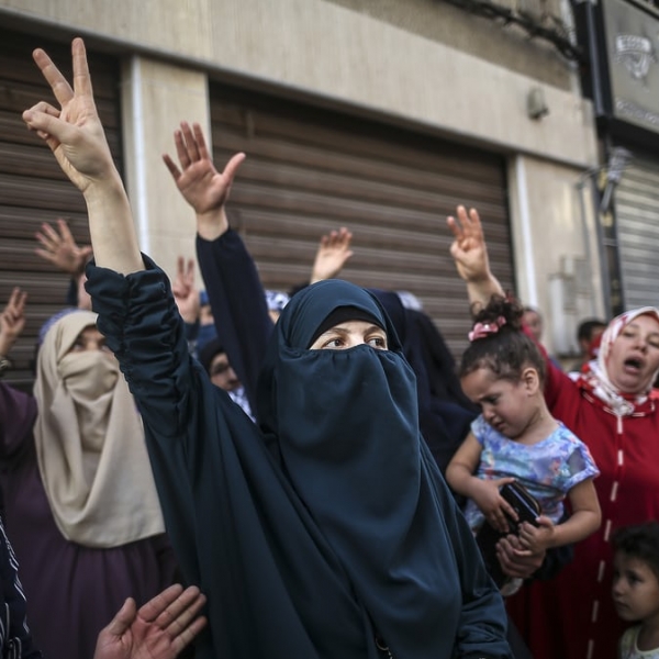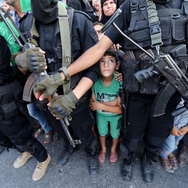 იბრაჰიმ აბუ მუსტაფა - ხან იუნისი, პალესტინა/ღაზას სექტორი: პალესტინელი ბიჭუნები დაჯგუფება „ჰამასის“ მებრძოლებს ეფარებიან.
