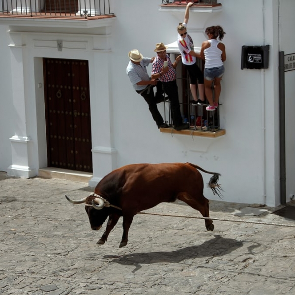 ხონ ნასკა - გრასალემა, ესპანეთი: ფანჯრებზე ამძვრალი ხალხი ხარს სახელად ტრომპეტეროს გაურბის ტორო დე კუერდას ფესტივალზე.