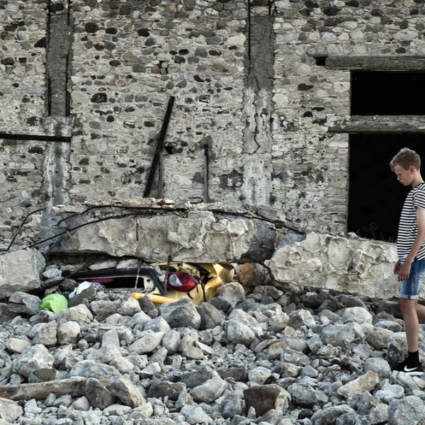 ლუიზა გულიამაკი - კოსი, საბერძნეთი: ბიჭუნა ჩამონგრეული სახლისა და დამტვრეული ავტომობილის წინ. 6.5 მაგნიტუდა სიძლიერის მიწისძვრამ ქალაქს მნიშვნელოვანი ზიანი მიაყენა.