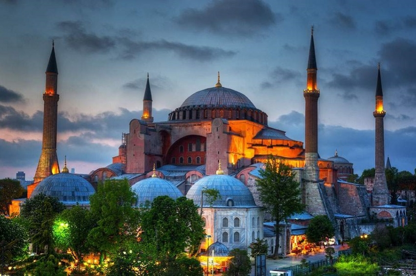 წმინდა სოფიას ტაძარი რომის იმპერიის დედაქალაქის, კონსტანტინოპოლის ცენტრში 324-337 წლებში შენდებოდა. ის მართლმადიდებლური ტაძარი იყო და მისი აშენება იმპერატორ კონსტანრინე პირველის სახელს უკავშირდება. 1453 წელს, როდესაც კონსტანტინოპოლი ოსმალეთის იმპერიამ დაიპყრო, სულთან მეჰმედ მეორემ ტაძარი მეჩეთად გადააკეთა. ოსმალეთის იმპერიის დროს შენობის კიდეებში მინარეთები აშენდა. ამის მიუხედავად, ტაძარში დღემდე შემონახულია ქრისტიანული და მუსლიმური ეპოქის ელემენტები.