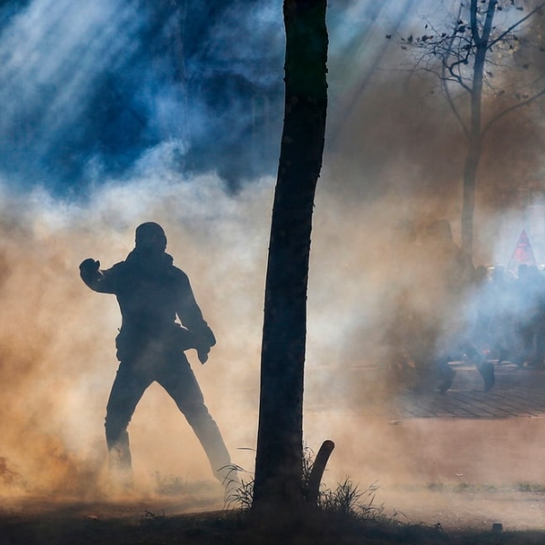 ეტიენ ლორანი - პარიზი, საფრანგეთი: მთავრობის შრომითი რეფორმების საწინააღმდეგო დემონსტრაციის მონაწილის სილუეტი კვამლში.