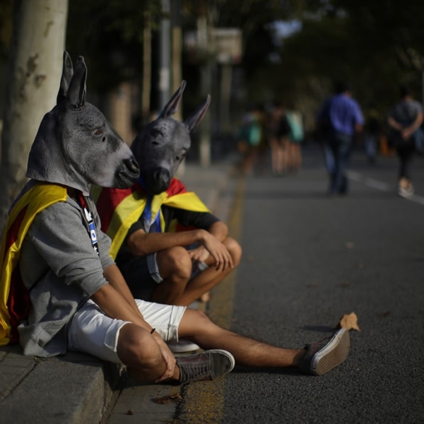 მანუ ფერნანდესი - ბარსელონა, ესპანეთი: ორი ახალგაზრდა მამაკაცი ვირის ნიღბებითა და კატალონიის დროშებით დამოუკიდებლობის რეფერენდუმისადმი მიძღვნილ საპროტესტო აქციაზე.