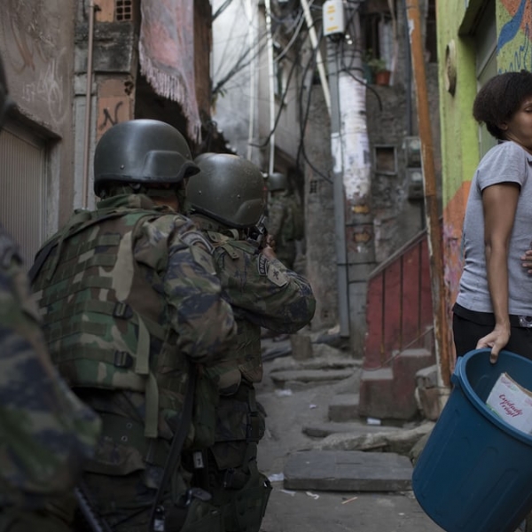 ლეო კორეა - რიო დე ჟანეირო, ბრაზილია: ფაველა როსინიას მაცხოვრებელი ქალი სპეცრაზმელების პატრულირებისას კედელს ეკვრება.