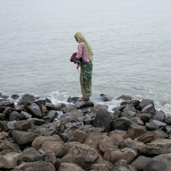 ფრედ დუფური - ტეკნაფი, ბანგლადეში: მიანმარიდან საზღვარზე გადასული ოჰინჯიელი ლტოლვილი ქალი ბავშვს მდინარე ნაფში ბანს.