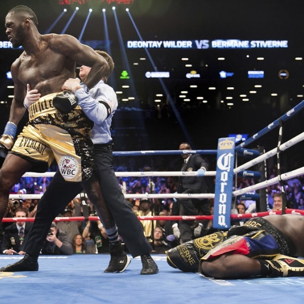 კევინ ჰაგენი - ნიუ იორკი, აშშ: დეონტეი უაილდერს WBC-ის ქამრისთვის ორთაბრძოლისას მსაჯი გვერდით წევს, მას შემდეგ, რაც მოკრივემ მეტოქე ბერმან სტივერნი ნოკ-აუტში გაისტუმრა.