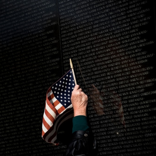 ბრენდან სმიალოვსკი - ვაშინგტონი, აშშ: მამაკაცი მემორიალზე დროშით მიანიშნებს ვიეტნამის ომში დაღუპულის სახელზე.