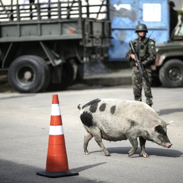 ანტონიო ლასერდა - რიო დე ჟანეირო, ბრაზილია: დედა ღორი ნარკოტრეფიკინგის საწინააღმდეგო სამხედრო ოპერაციის მონაწილე ჯარისკაცების ფონზე.