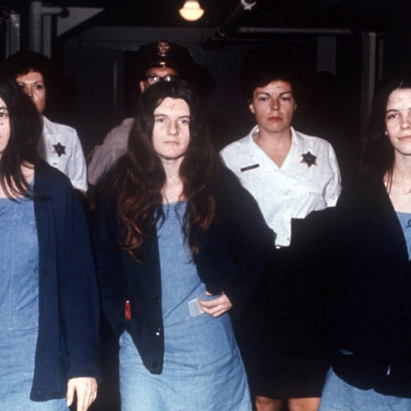 სექტა „ოჯახის“ წევრები: სიუზენ ატკინსი, პატრისია კრენვინკელი და ლესლი ვან ჰაუტენი 1971 წლის სასამართლო პროცესზე.