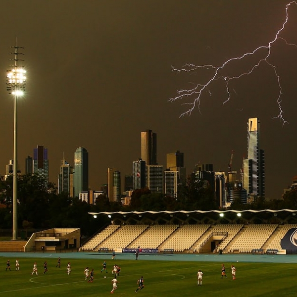 სკოტ ბარბური - მელბურნი, ავსტრალია: მელბურნის „ვიქტორისა“ და სიდნეის „ვესტერნ სიდნი უონდერერზის“ საფეხბურთო მატჩი ელვის ფონზე.