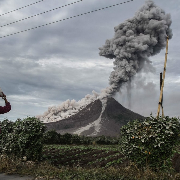 ივან დამანიკი - კარო, ინდონეზია: ფერმერი მინდორში გადაადგილდება მთა სინაბურგიდან ამოფრქვეული ვულკანური ფერფლის ფონზე.
