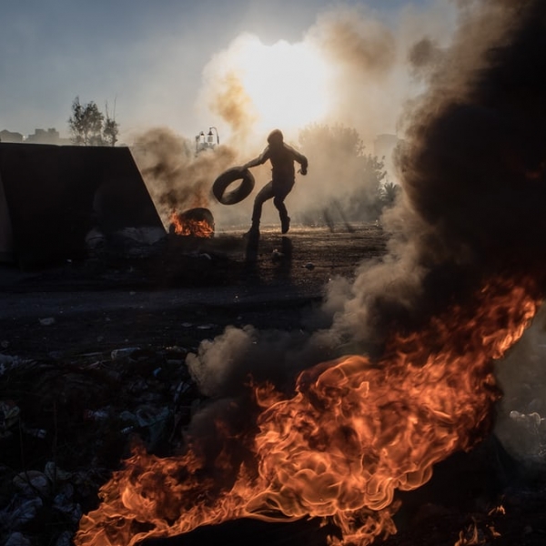 ქრის მაკგრათი - რამალა, პალესტინა: პროტესტის მონაწილე ისრაელის სპეცრაზმთან შეტაკებისას ცეცხლში საბურავს აგდებს.