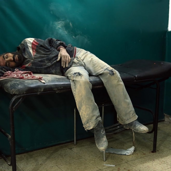 ამარ სულეიმანი - დამასკო, სირია: დაბომბვას გადარჩენილი მამაკაცი ზამალქას საავადმყოფოში მკურნალობის რიგს ელოდება.