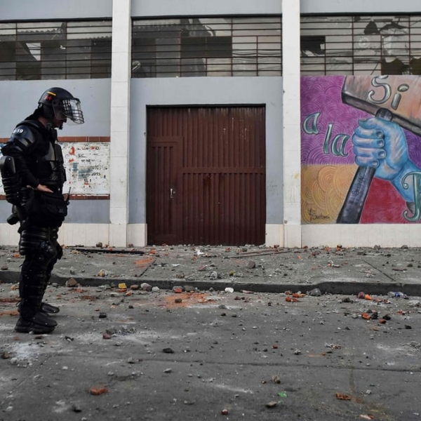 ლუის რობაიო - იუმბო, კოლუმბია: პოლიციის სპეცრაზმელი დარბეულ ქუჩაში, სადაც „ტიმოჩენკოს“ მეტსახელით ცნობილი საპრეზიდენტო კანდიდატ ლონდონიო ეჩევერის აქცია უნდა გამართულიყო.