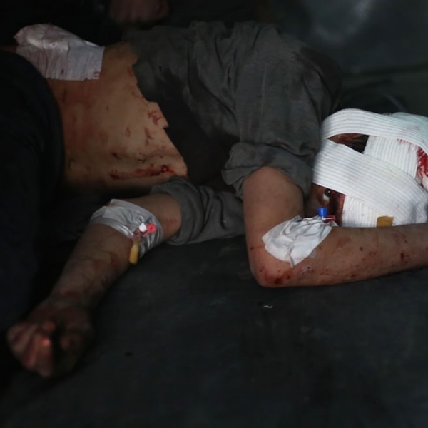 ამერ ალმოჰიბანი - ზამალქა, სირია: საჰაერო იერიშების შედეგად დაშავებული ბავშვი საავადმყოფოში ზედამხედველობის რიგს უცდის.