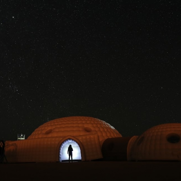 ქარიმ საჰიბი - დჰოფარი, ომანი: მარსის მისია AMEDEE-18-ის მონაწილე სიმულაციისთვის საჭირო შენობის კართან დგას.
