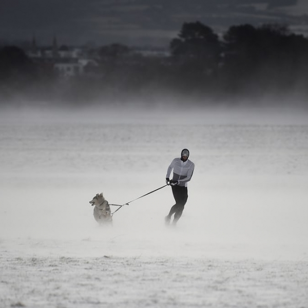 კლოდა კილკოინი - დუბლინი, ირლანდია: ქალი ჰასკის ჯიშის ძაღლთან ერთად დათოვლილ ფენიქსის პარკში.