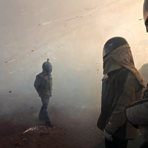 ტაირონ სიუ - ტაინანი, ტაივანი: სამხრეთ-დასავლეთ ტაივანში გამართულ ფესტივალზე ადამიანები მოტოციკლისტის ჩაფხუტით თავს ფოიერვერკებისგან იცავენ.