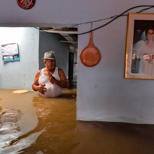 ლუის რობაიო - კალი, კოლუმბია: მამაკაცი ძლიერი წვიმების შედეგად ადიდებული მდინარე კუკას მიერ დატბორილ სახლში გადაადგილდება.