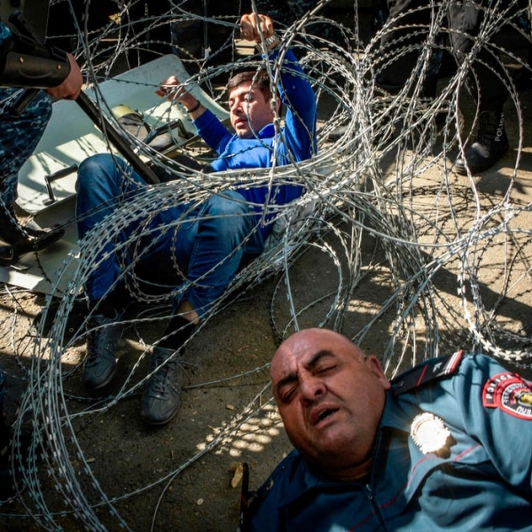 კარენ მინასიანი - ერევანი, სომხეთი: დემონსტრანტი და პოლიციელი მავთულხლართებში.
