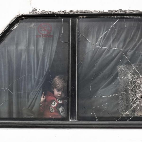 სამირ ალ-დუმი - დუმაირი, სირია: გოგონა დაზიანებული ავტობუსის ფანჯარაში იყურება.